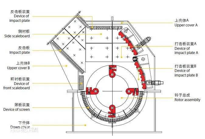 Структура проста і складається з кожуха, ротора та ударної пластини. Основна робоча частина ударної дробарки-це високошвидкісний обертовий ротор з молотком з пластиною. Під час зворотного процесу впливу матеріали також стикаються між собою. Оскільки матеріал потрапляє в пластину молот, вплив ударної пластини та зіткнення між собою, тріщини та послаблення постійно генеруються всередині, що врешті -решт призводить до подрібнення. Пристрій удару використовується для витримки матеріалу, який потрапляє в пластину молот і відскочив його. Основна складова - це ударна пластина, яка зварена сталевими пластинами. На його ударній поверхні є стійкі до зносу, а деякі використовують ударні смуги або решітки.